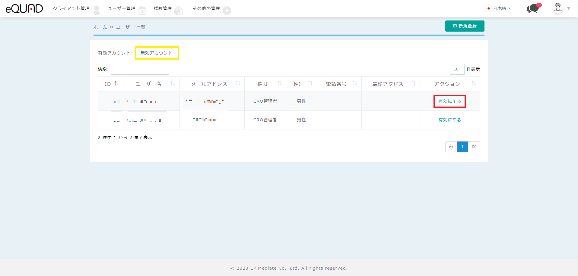 ②有効にする場合:「無効アカウント」タブを開いた状態で、有効にしたいユーザーの「有効にする」を押下してください。