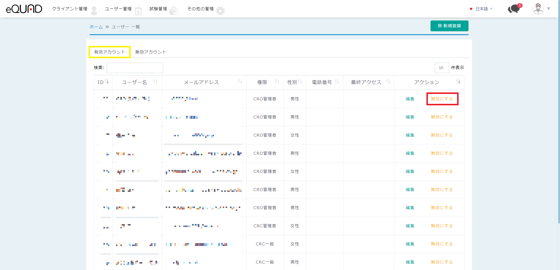 ②無効にする場合:「有効アカウント」タブを開いた状態で、無効にしたいユーザーの「無効にする」を押下してください。