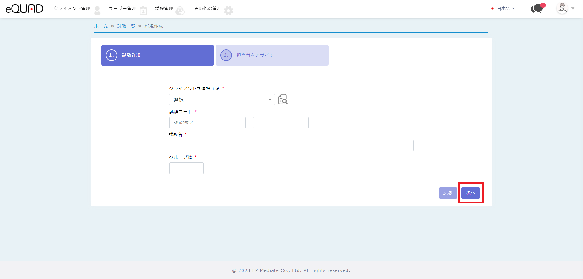 ③ 試験詳細を入力の上、「次へ」を押下してください。