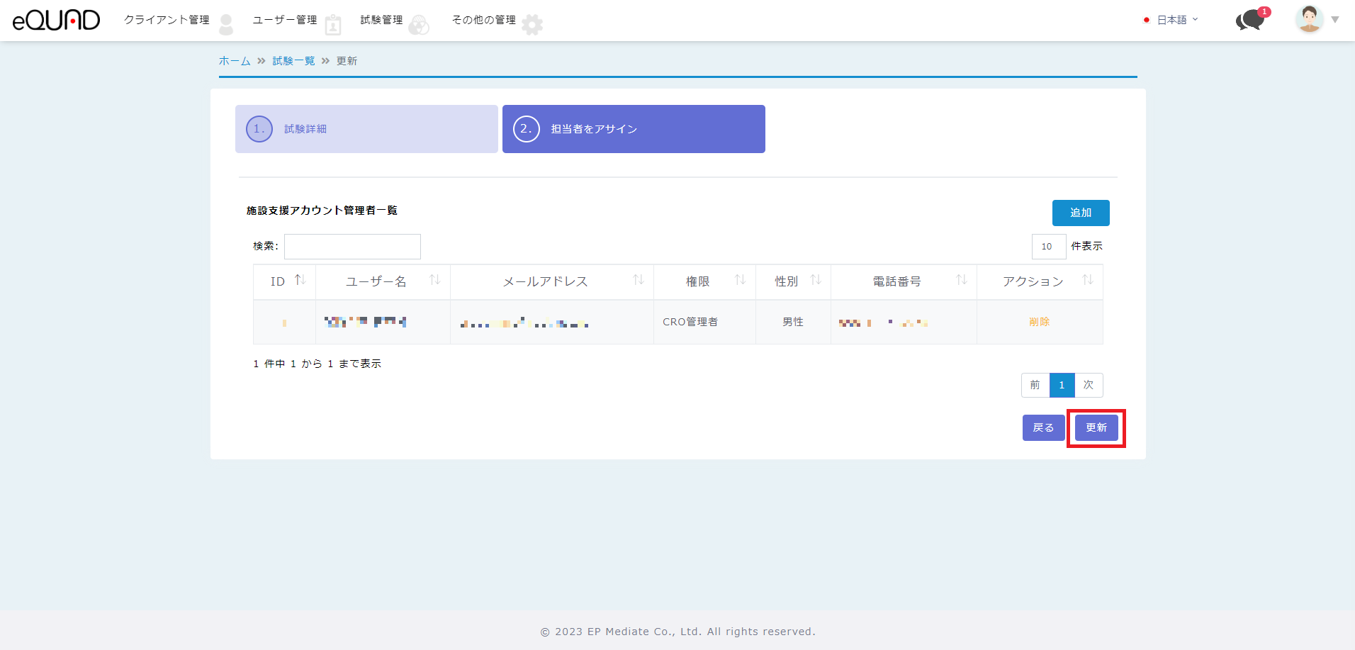 ④ 担当者の変更がある場合は「追加」もしくは「削除」ボタンより変更後、「更新」を押下してください。