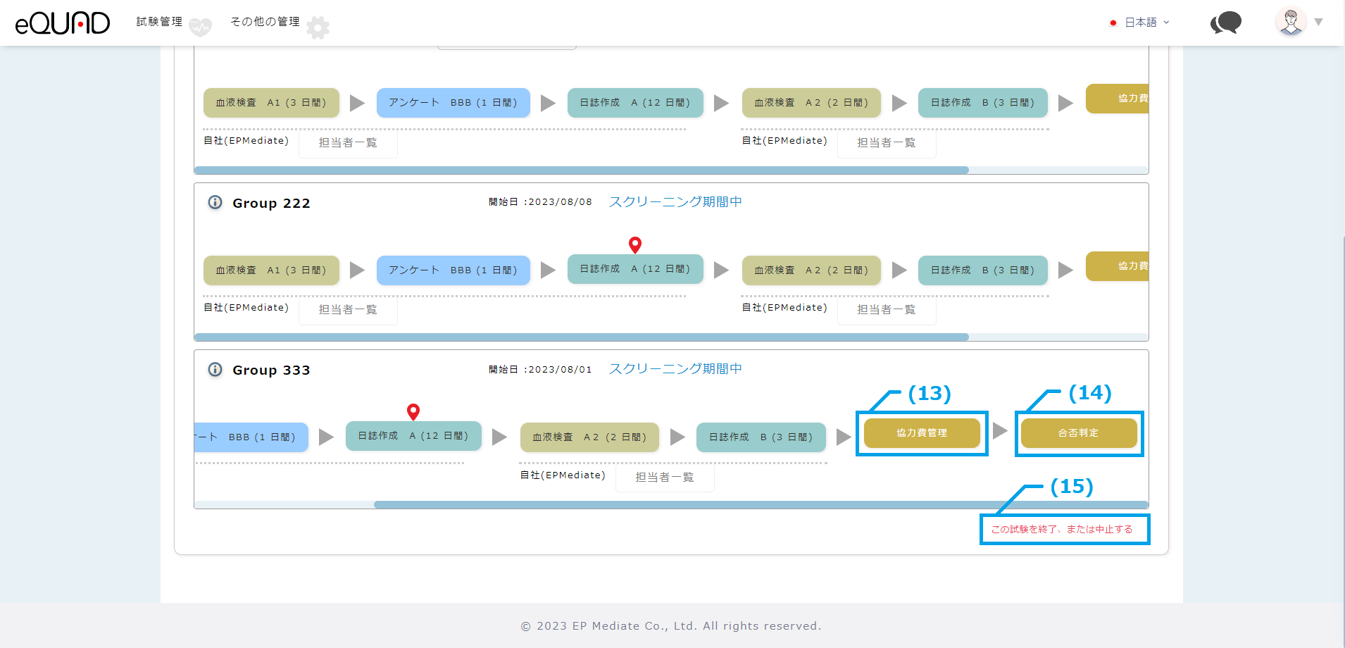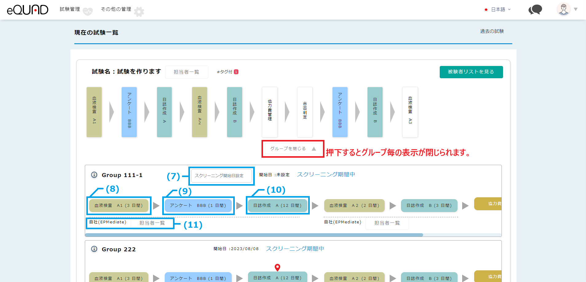 (11) 点線箇所に対する担当者が確認できます。※画像の場合は、「血液検査A1」「アンケートBBB」「日誌作成A」に対する担当者。