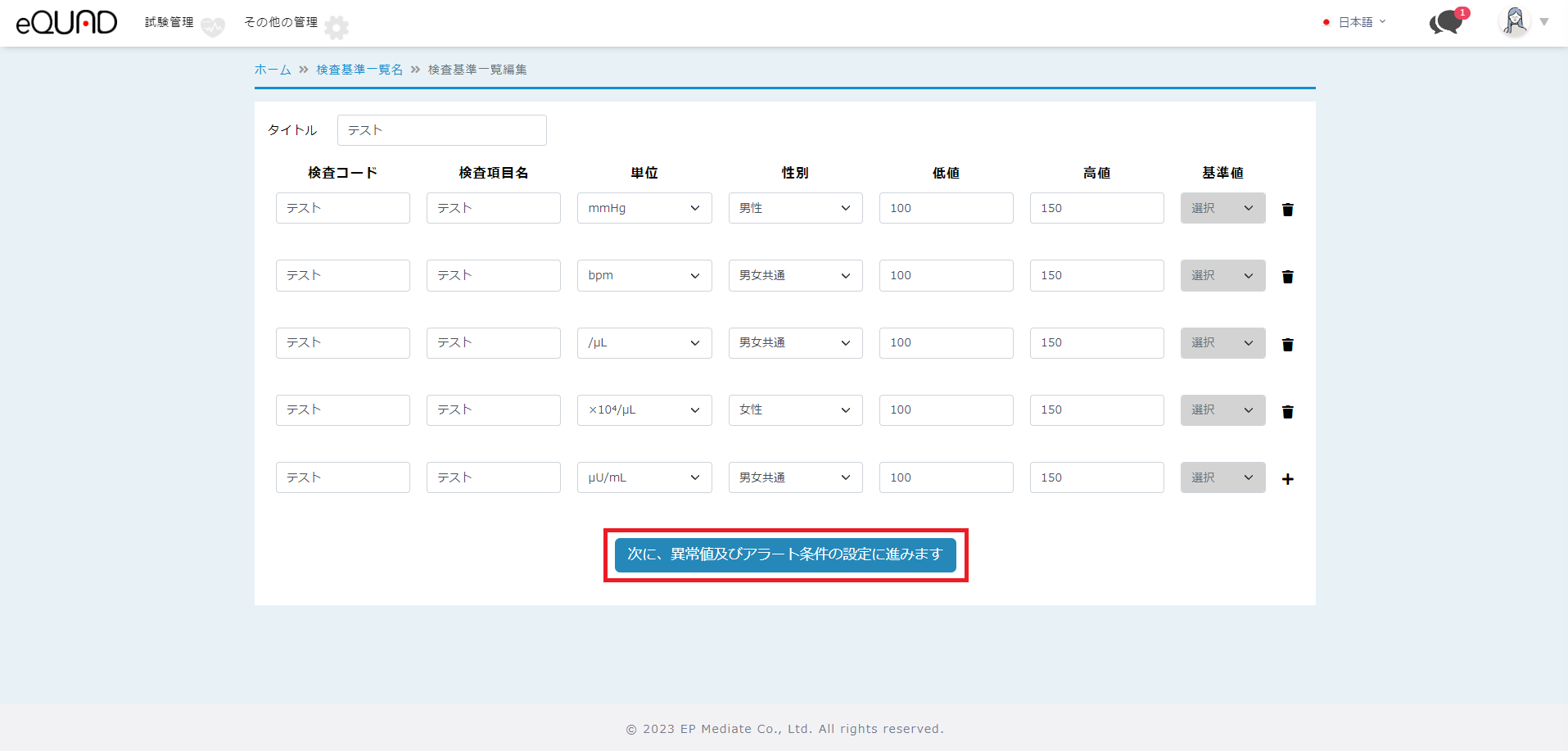 ③ 編集したい項目を入力の上、「次に、異常値及びアラート条件の設定に進みます」を押下してください。