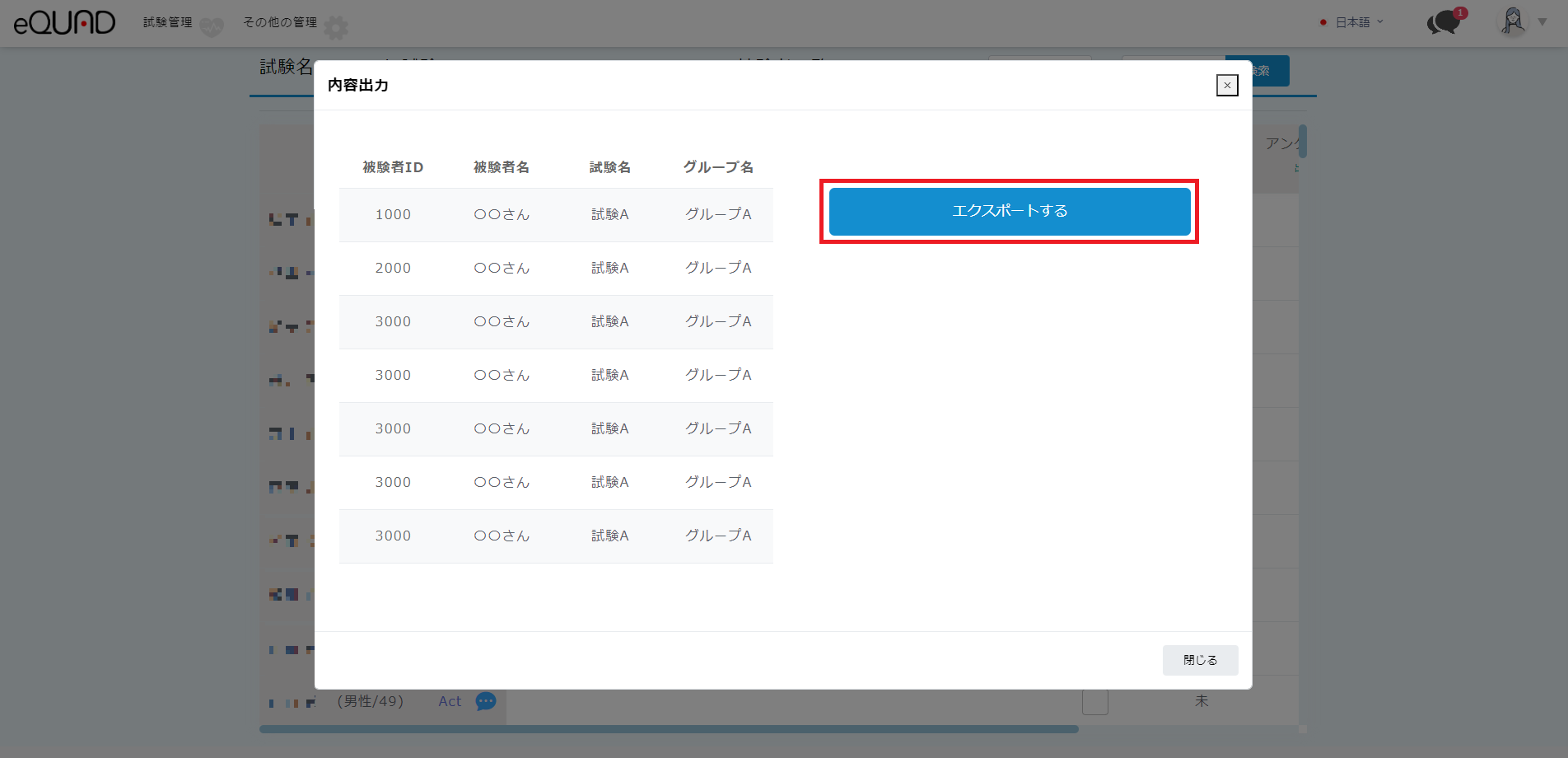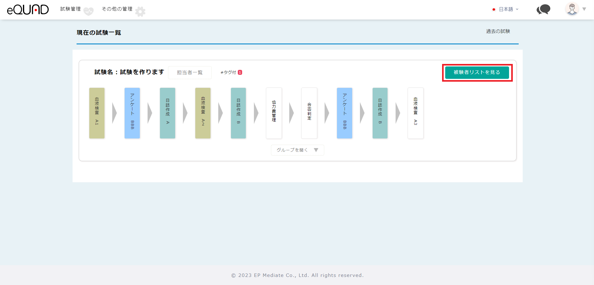 ① 現在の試験一覧画面の「被験者リストを見る」を押下します。