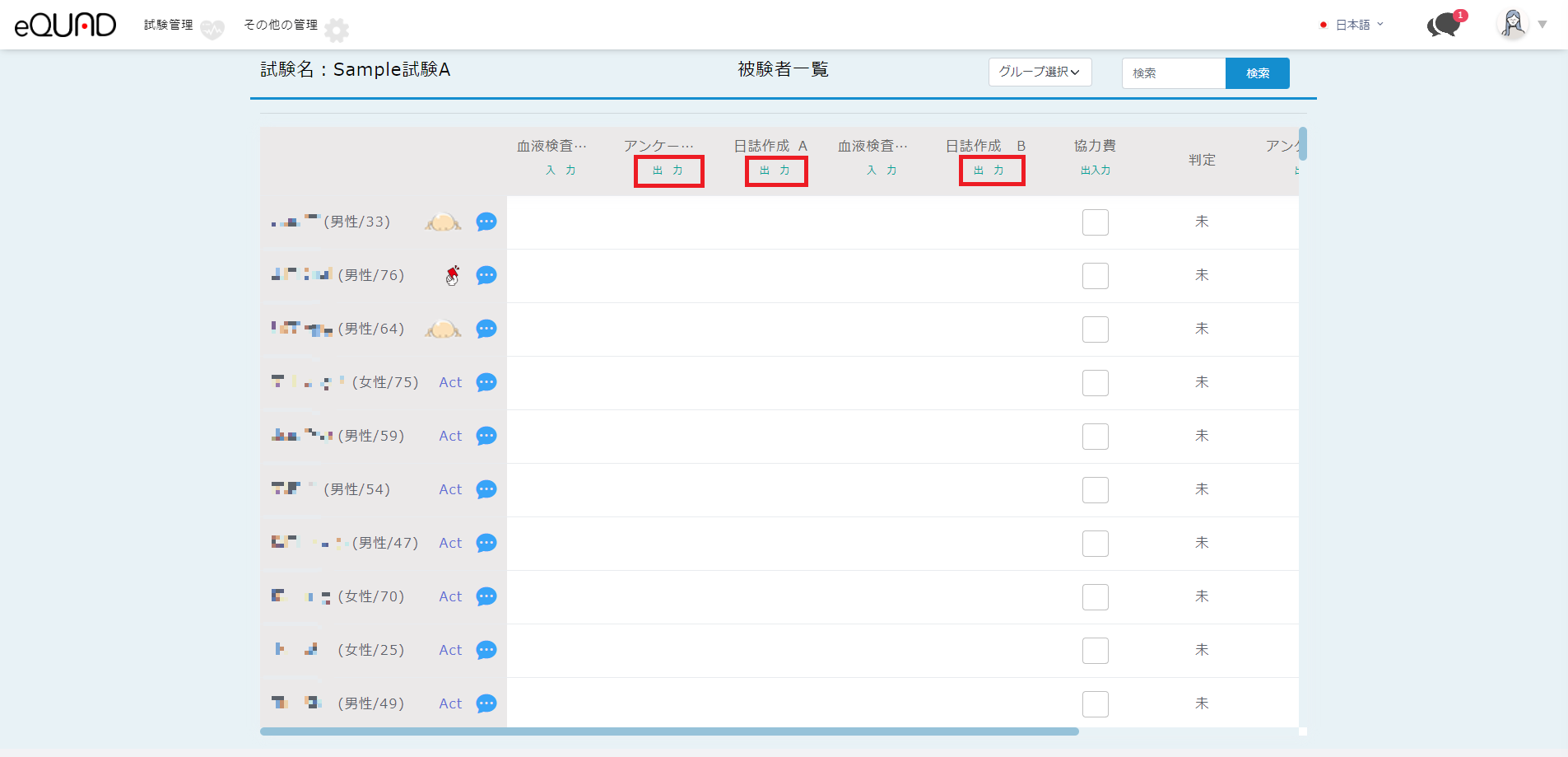 ② アンケートもしくは、日誌の「出力」を押下します。