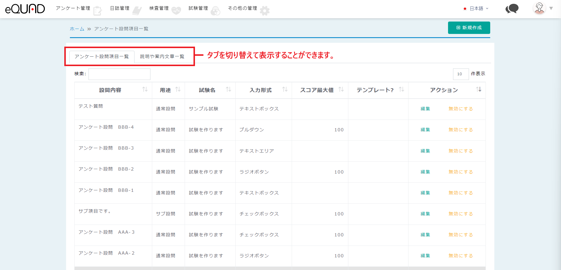 ・アンケート設問項目一覧は、「アンケート設問項目一覧」「説明や案内文章一覧」よりタブを切り替えて表示することができます。※下記画像をご参照ください。