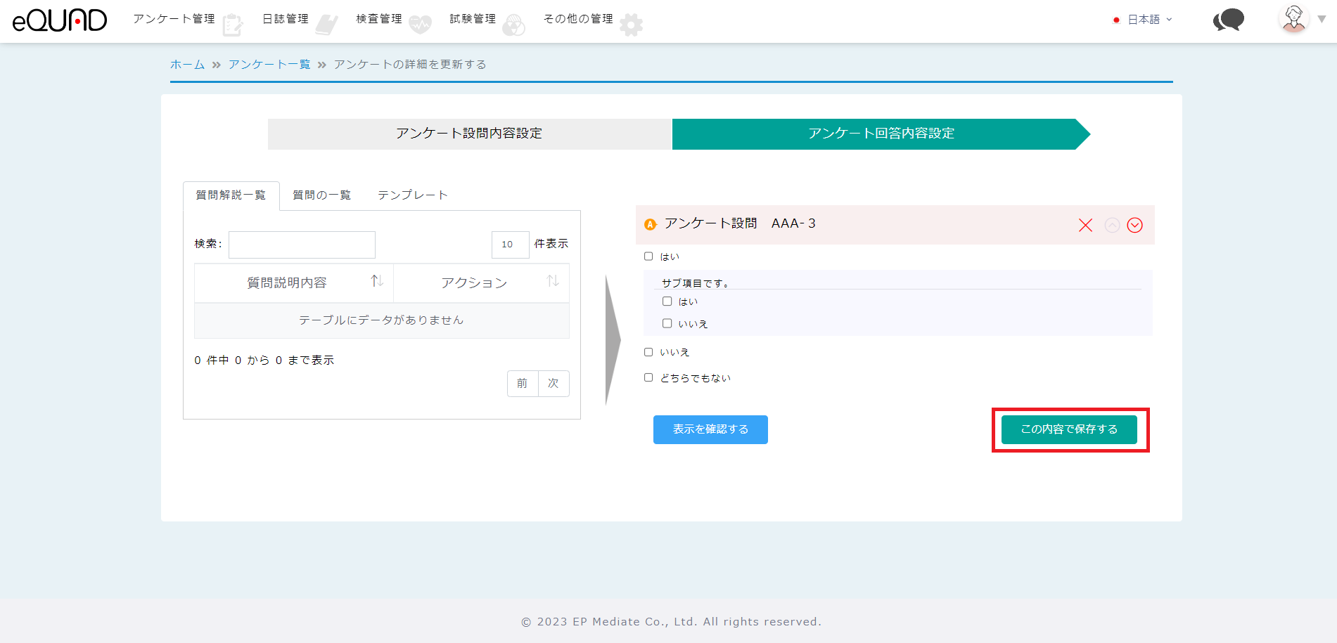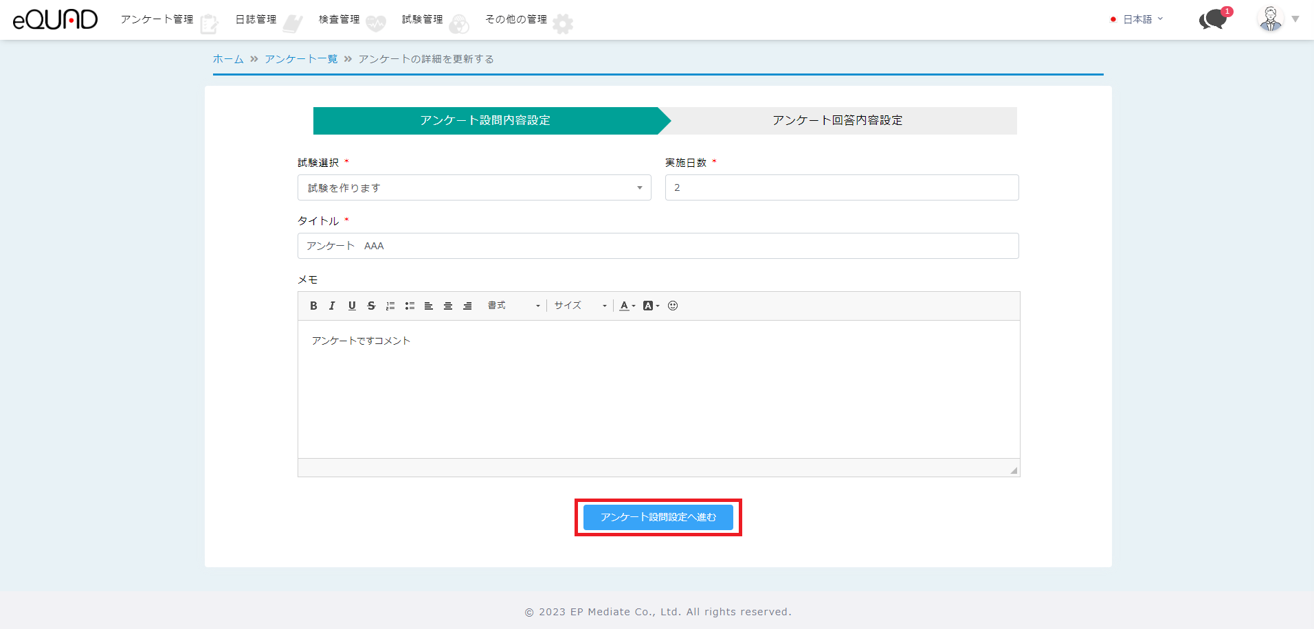 ③ 編集したい項目を入力の上、「アンケート設問設定へ進む」を押下してください。