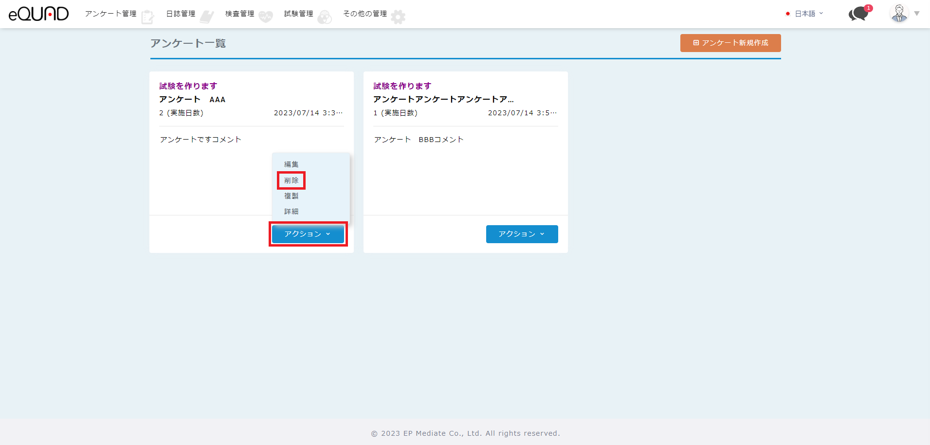 ① 削除したいアンケートの「アクション」を押下して、「削除」を選択します。