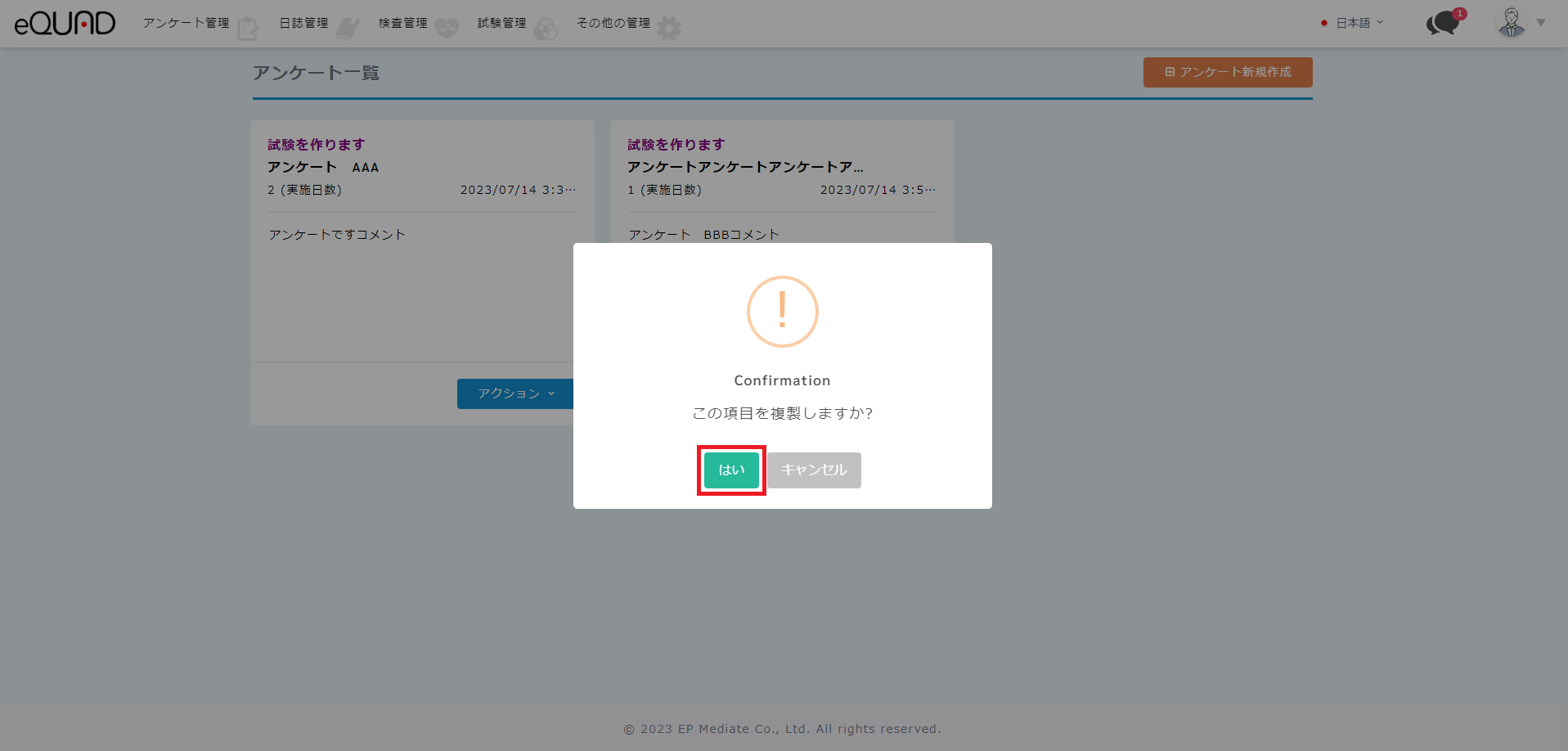 ① 複製したいアンケートの「アクション」を押下して、「複製」を選択します。