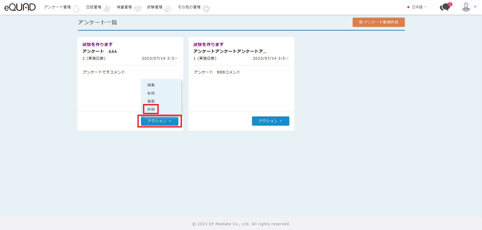 ① プレビューを表示したいアンケートの「アクション」を押下して、「詳細」を選択します。