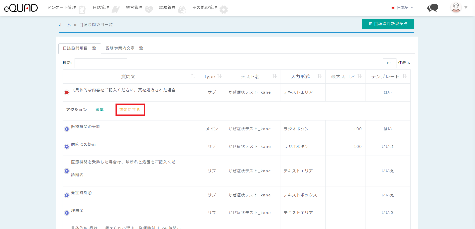 ③ 無効にする場合:無効にしたい設問の「無効にする」を押下してください。