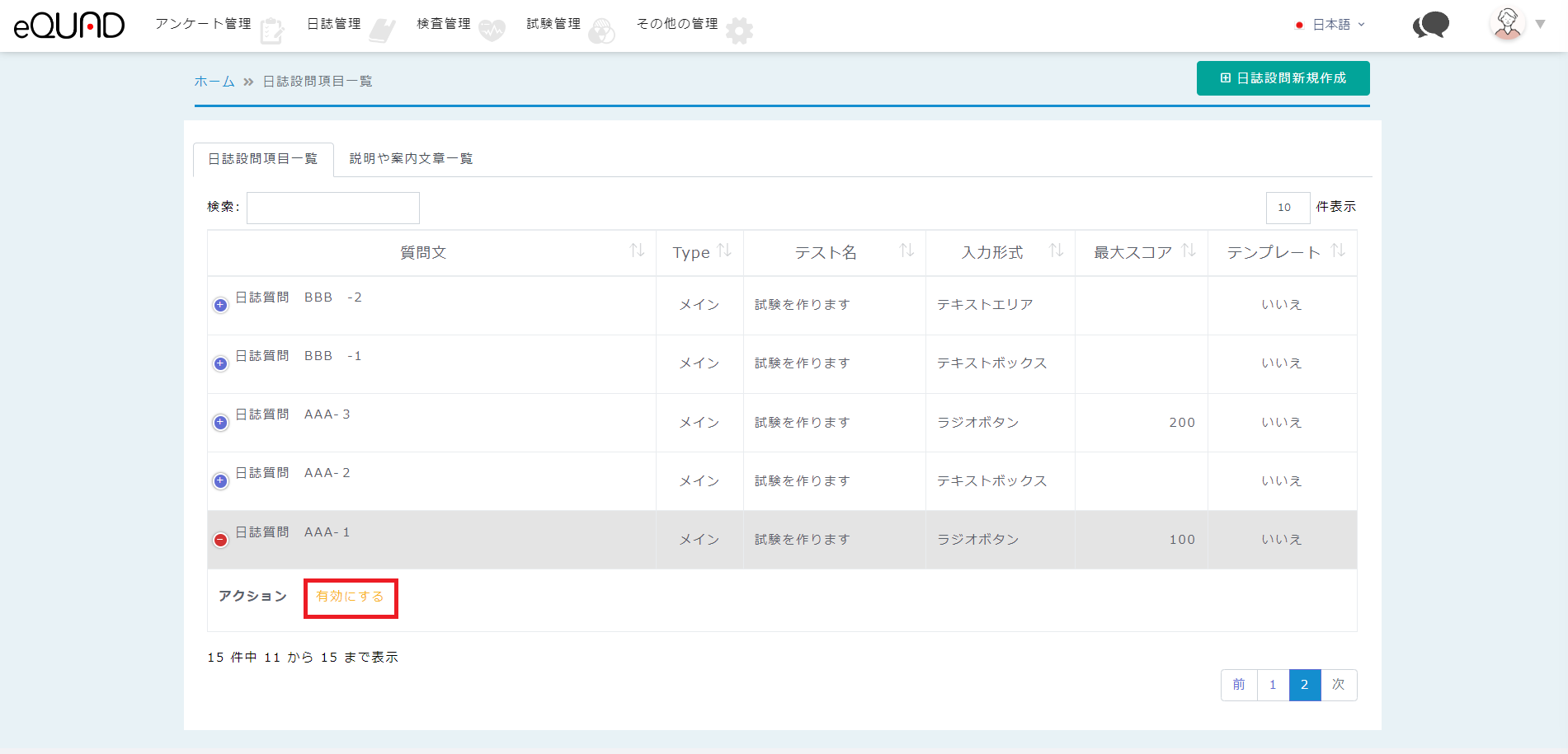 ③ 有効にする場合:有効にしたい設問の「有効にする」を押下してください。