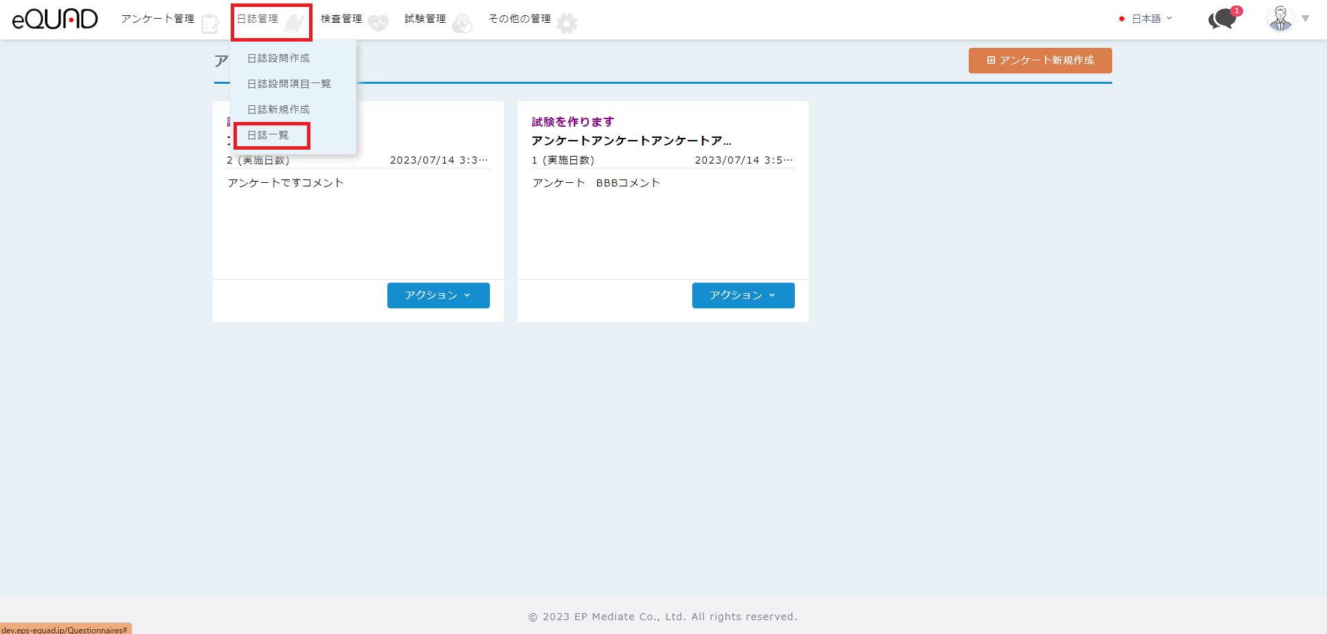 ① 「日誌管理」「日誌一覧」を押下してください。