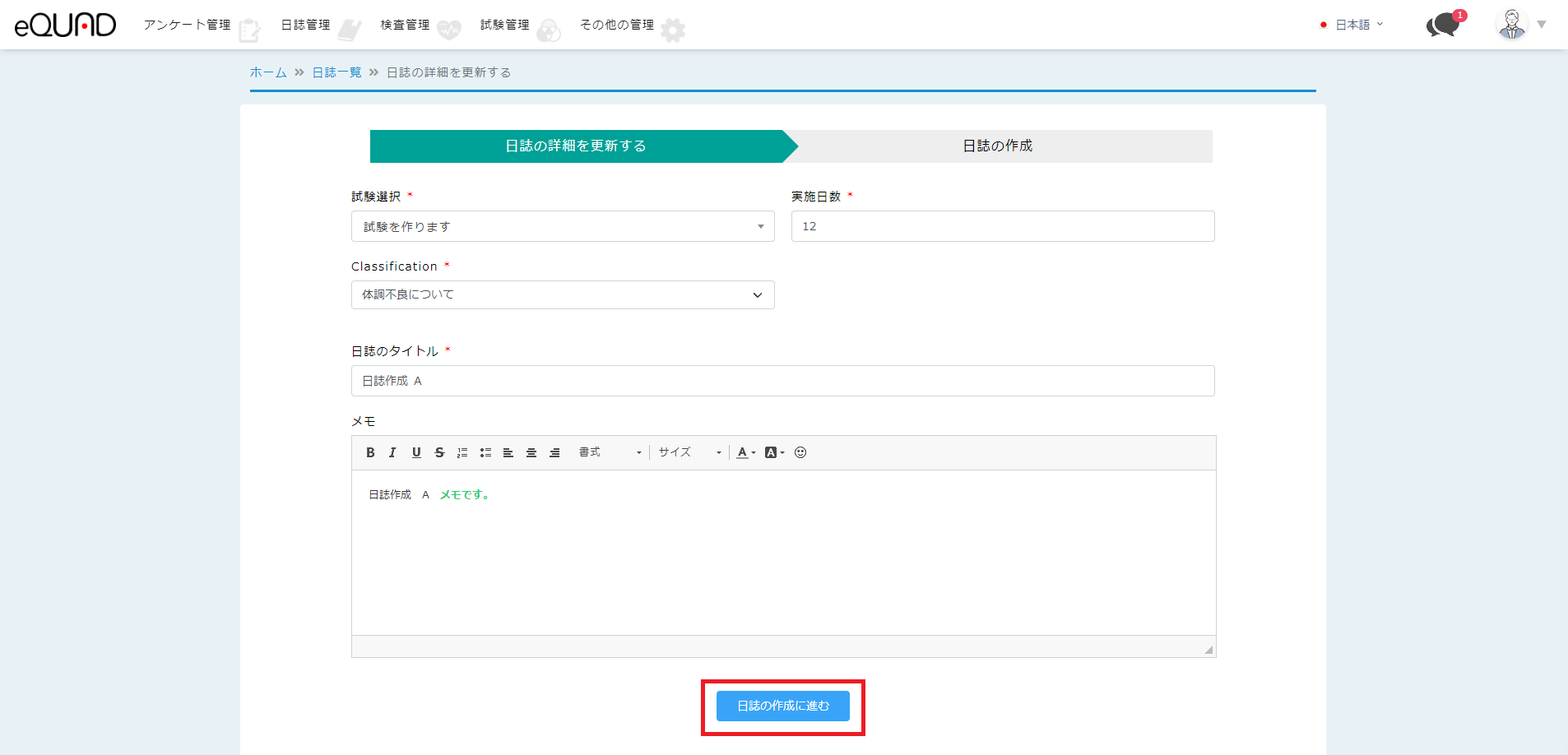 ③ 編集したい項目を入力の上、「日誌の作成に進む」を押下してください。