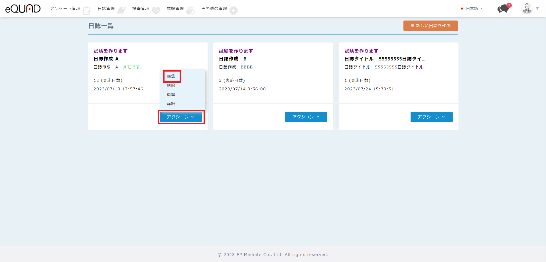 ② 編集したい日誌の「アクション」を押下して、「編集」を選択してください。