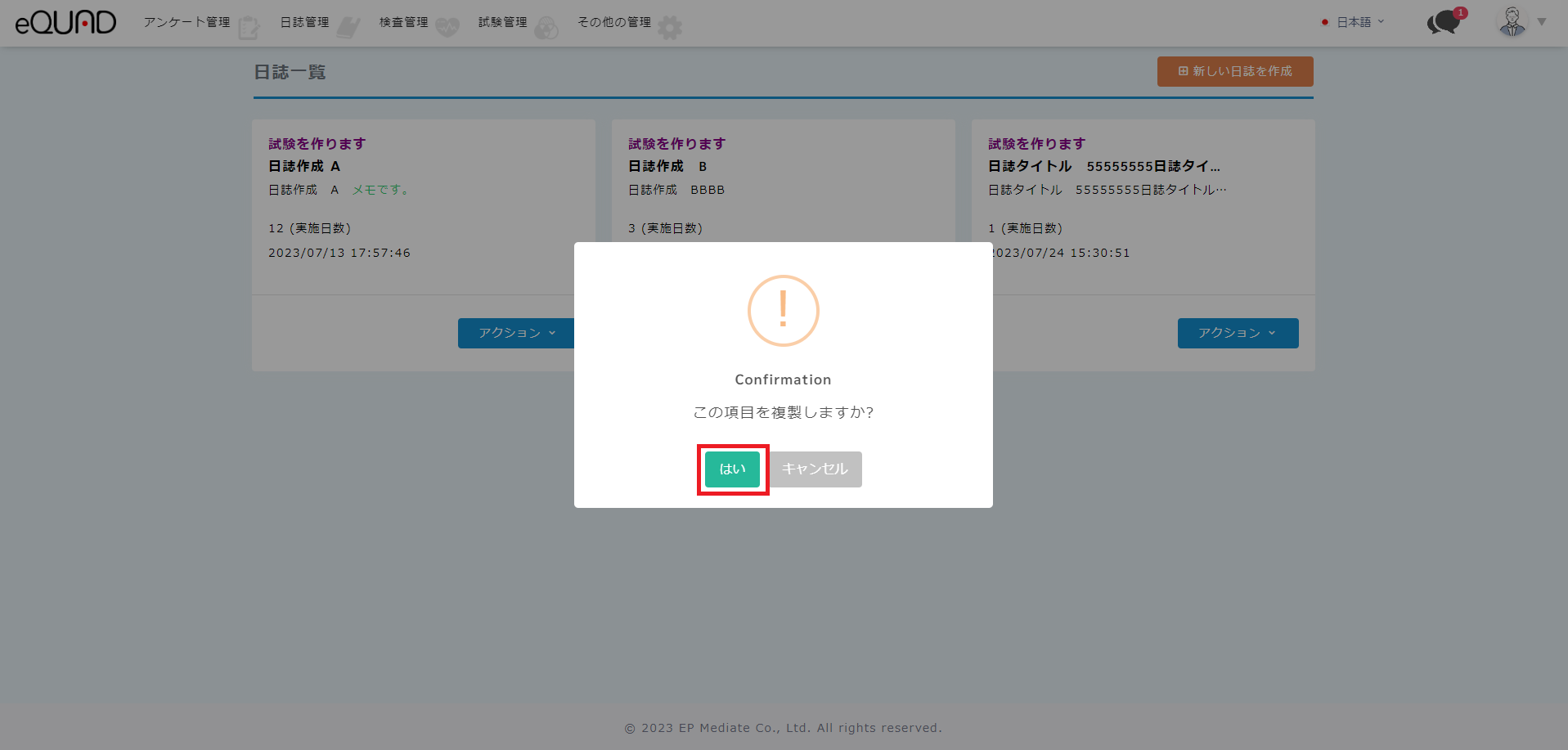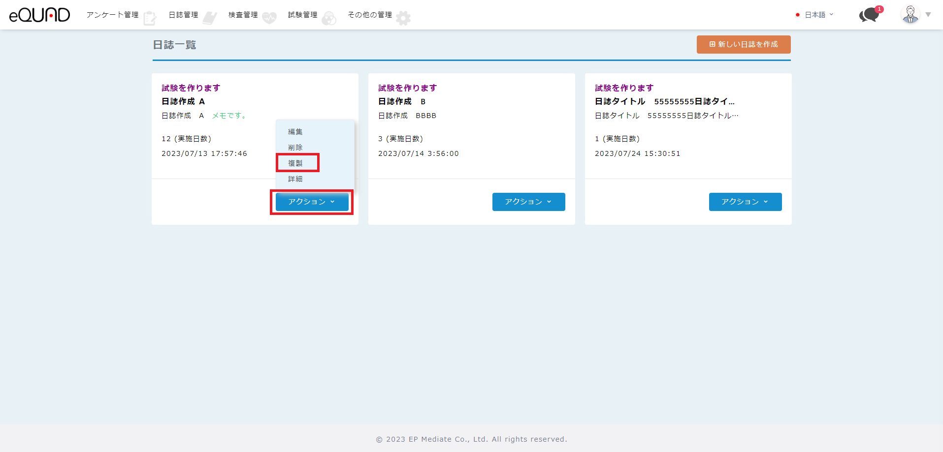 ① 複製したい日誌の「アクション」を押下して、「複製」を選択します。
