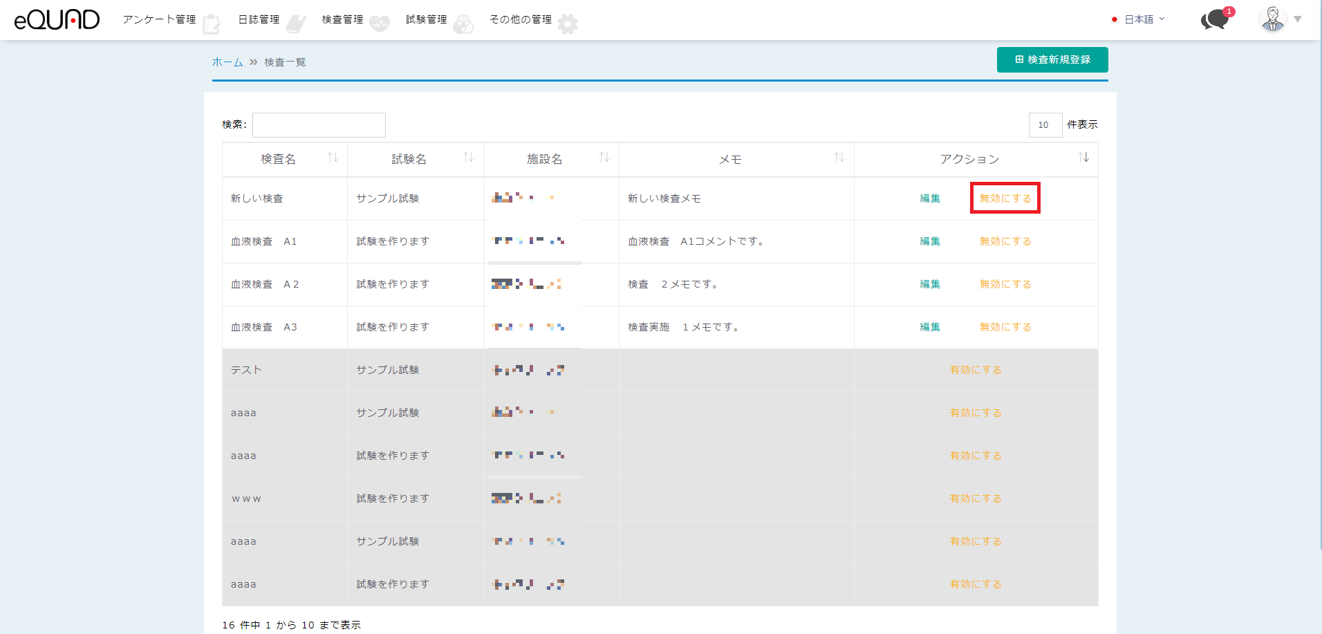 ② 無効にする場合:無効にしたい検査の「無効にする」を押下してください。