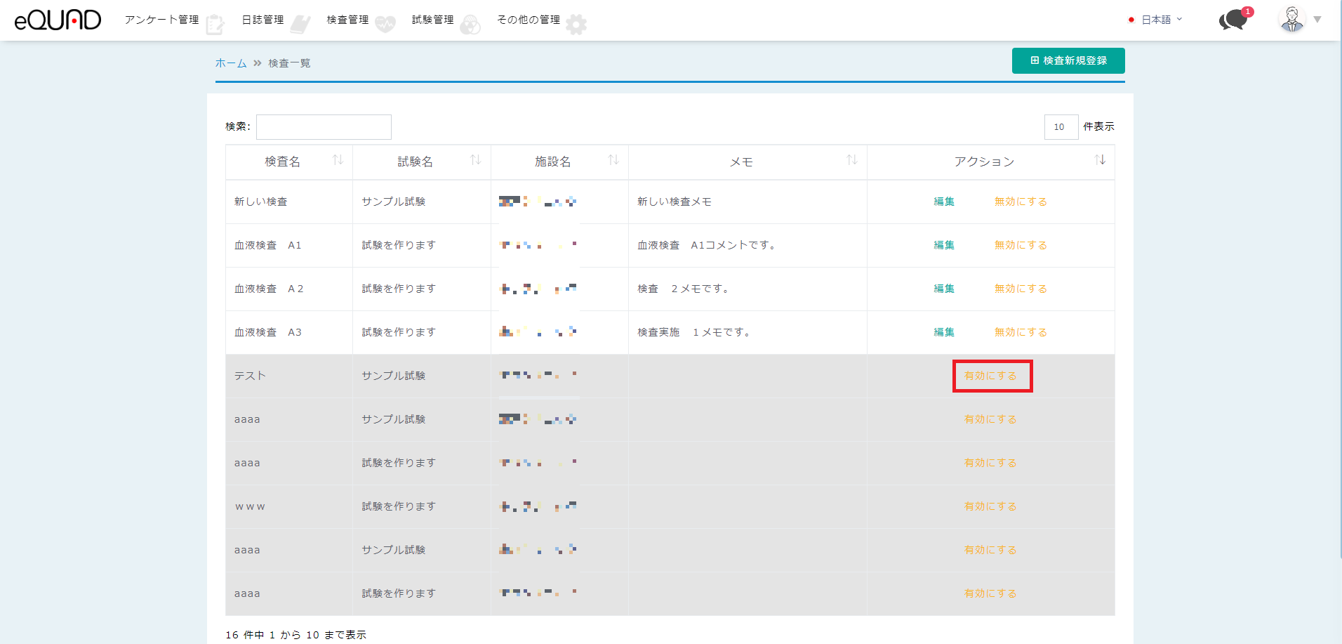 ② 有効にする場合:有効にしたい検査の「有効にする」を押下してください。