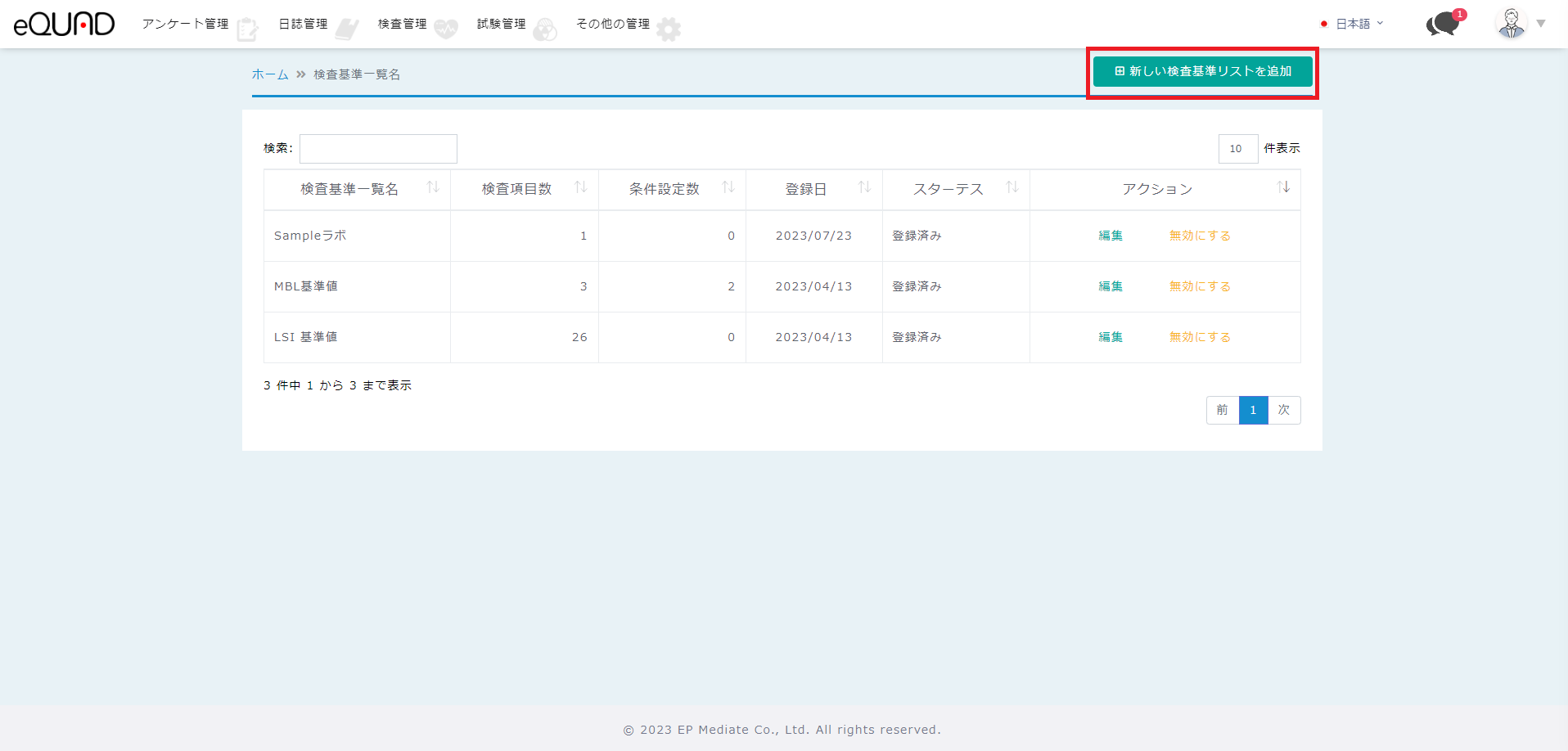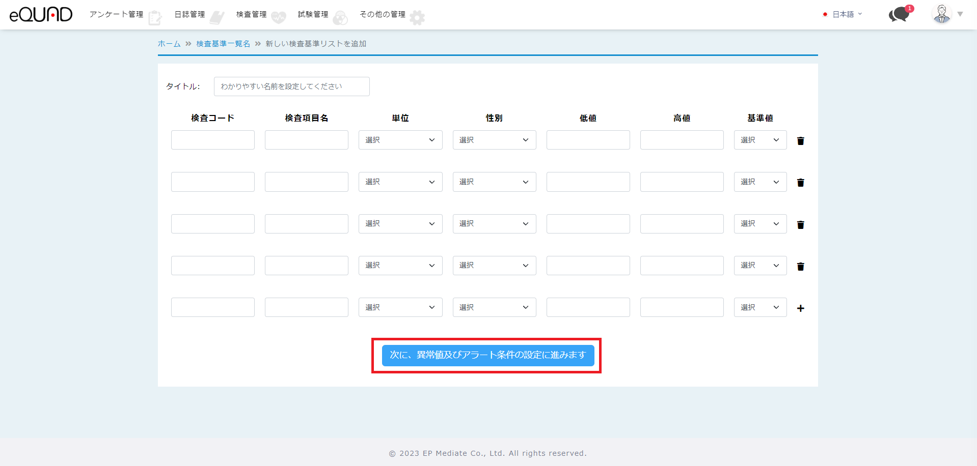 ③ 検査基準情報を入力の上、「次に、異常値及びアラート条件の設定に進みます」を押下してください。