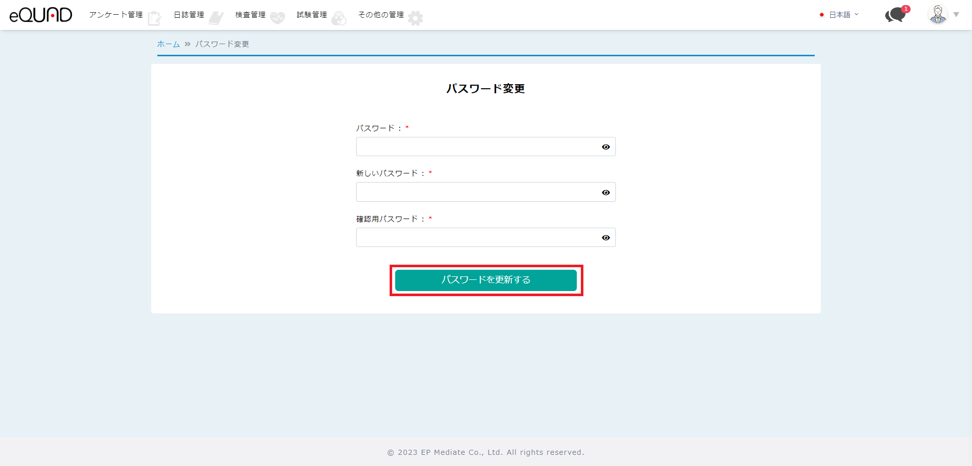 ② 現在のパスワード/新しいパスワード(2回)を入力の上、「パスワードを更新する」を押下してください。