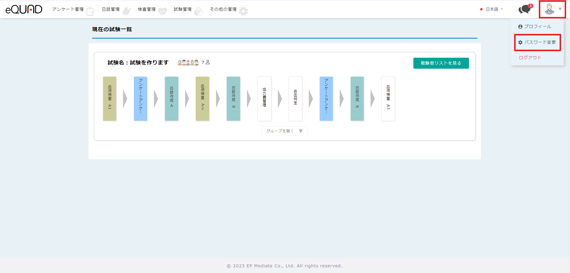 ① 画面右上のアイコンをクリックして、「パスワード変更」を押下してください。
