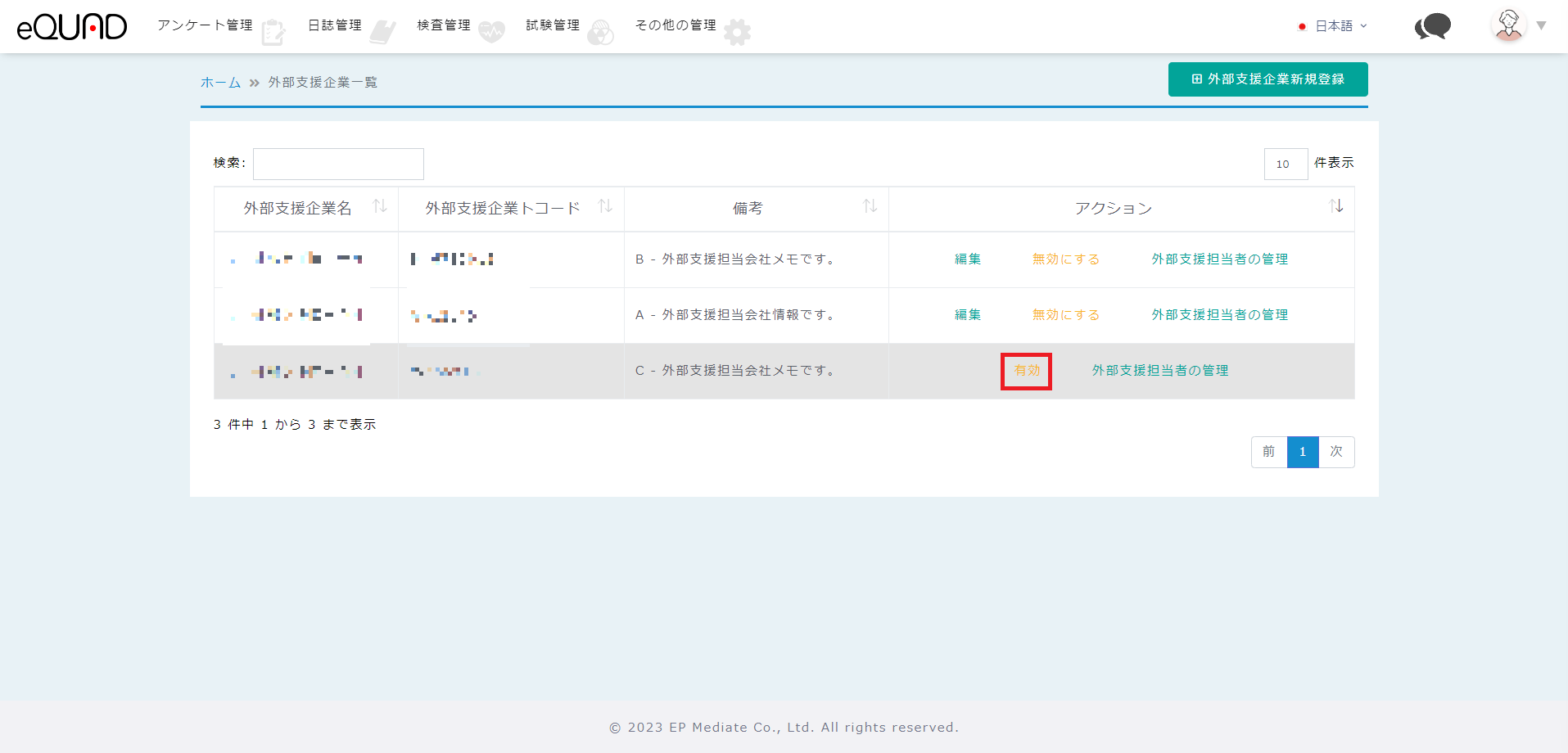 ② 有効にする場合:有効にしたい外部支援企業の「有効」を押下してください。
