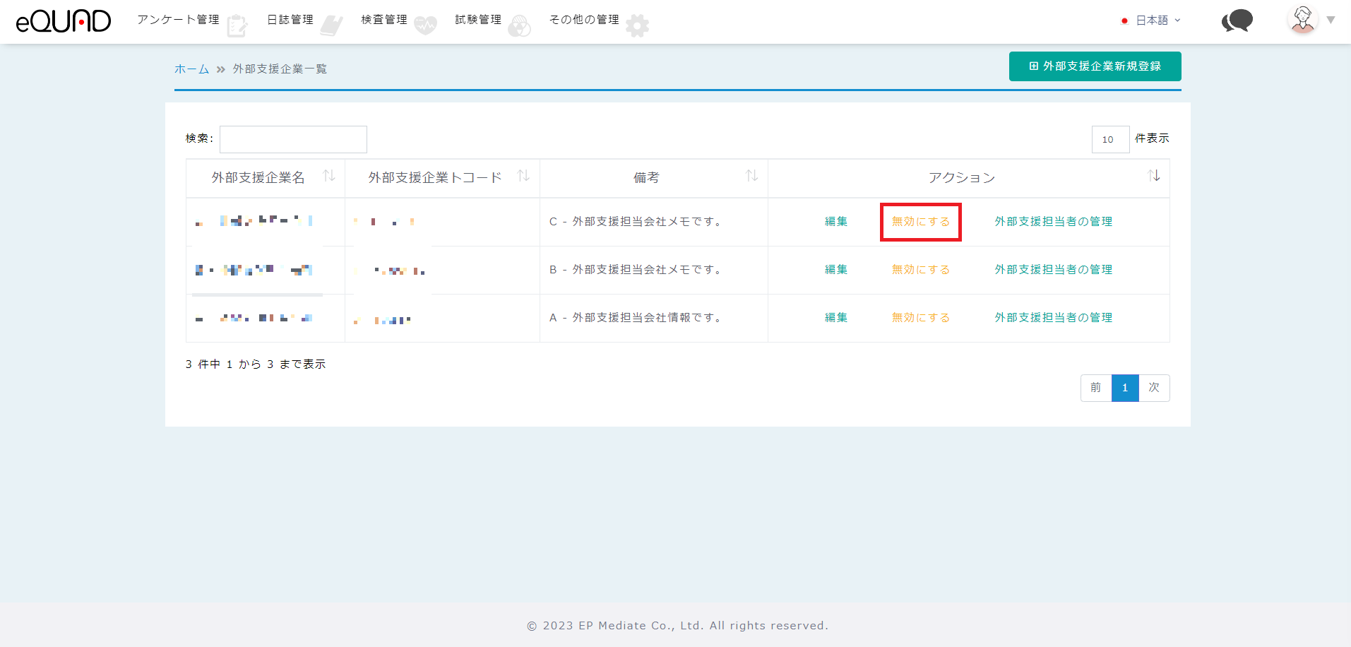 ② 無効にする場合:無効にしたい外部支援企業の「無効にする」を押下してください。